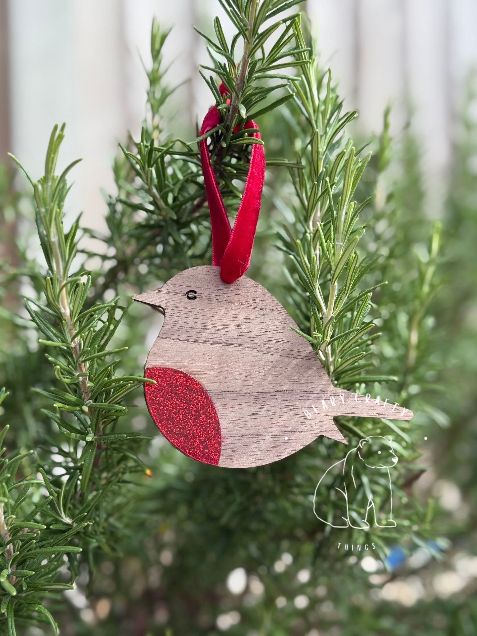 Add a charming touch to your Christmas tree with this delightful Robin Red Breast ornament. Made from smooth American black walnut veneer, it features a bright red glitter breast that twinkles with festive cheer. Lightweight and easy to hang, this playful bird brings warmth and joy to your holiday décor.